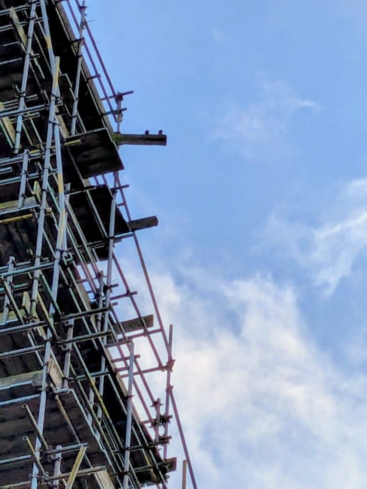 Scaffolding beam hanging off church